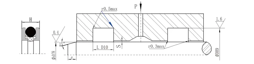 | Rekesznyílás D H9 | Horony átmérőjű D H9 | Horony szélessége L+0,2 | Pecsétmagasság L1 | Lekerekített sarok RMAX | Sugárirányú távolság s | Kamer Zminiszterelnök | O-gyűrűs huzal átmérőjű d0 | ||