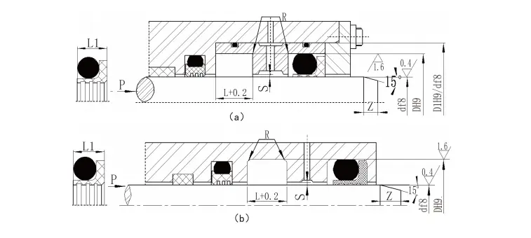 | 2. A forgó tömítésnél a forgó tengely felületi keménységét javasoljuk HRC ≥58. 3. A 30mPa -nál nagyobb nyomás esetén a H8/F8 ajánlott az extrudálási réshez. | ||||||||||