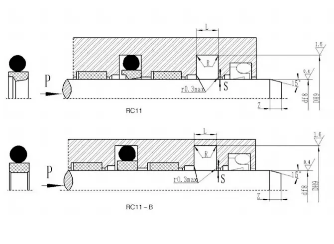 Az RC11-B egy kitöltött PTFE téglalap alakú tömítőgyűrűből és egy O alakú gumi gyűrűből áll, amely alkalmas hidraulikus viszonzó mozgásra, kétirányú nyomás tömítésre. Az O-gyűrű sugárirányú erőt biztosít és kompenzálja a tömítőgyűrű kopását. Általában egy vezetőgyűrűvel együtt használják. A split (nyitott) hornyokat a 30 mm -nél kisebb rudak átmérőjéhez kell használni. Jellemzők: