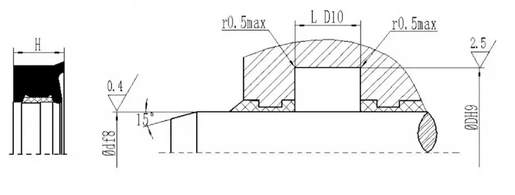 | Rúd átmérője DF8 | Horony külső átmérője DH9 | Rés szélessége L d10 | Pecsétmagasság H |